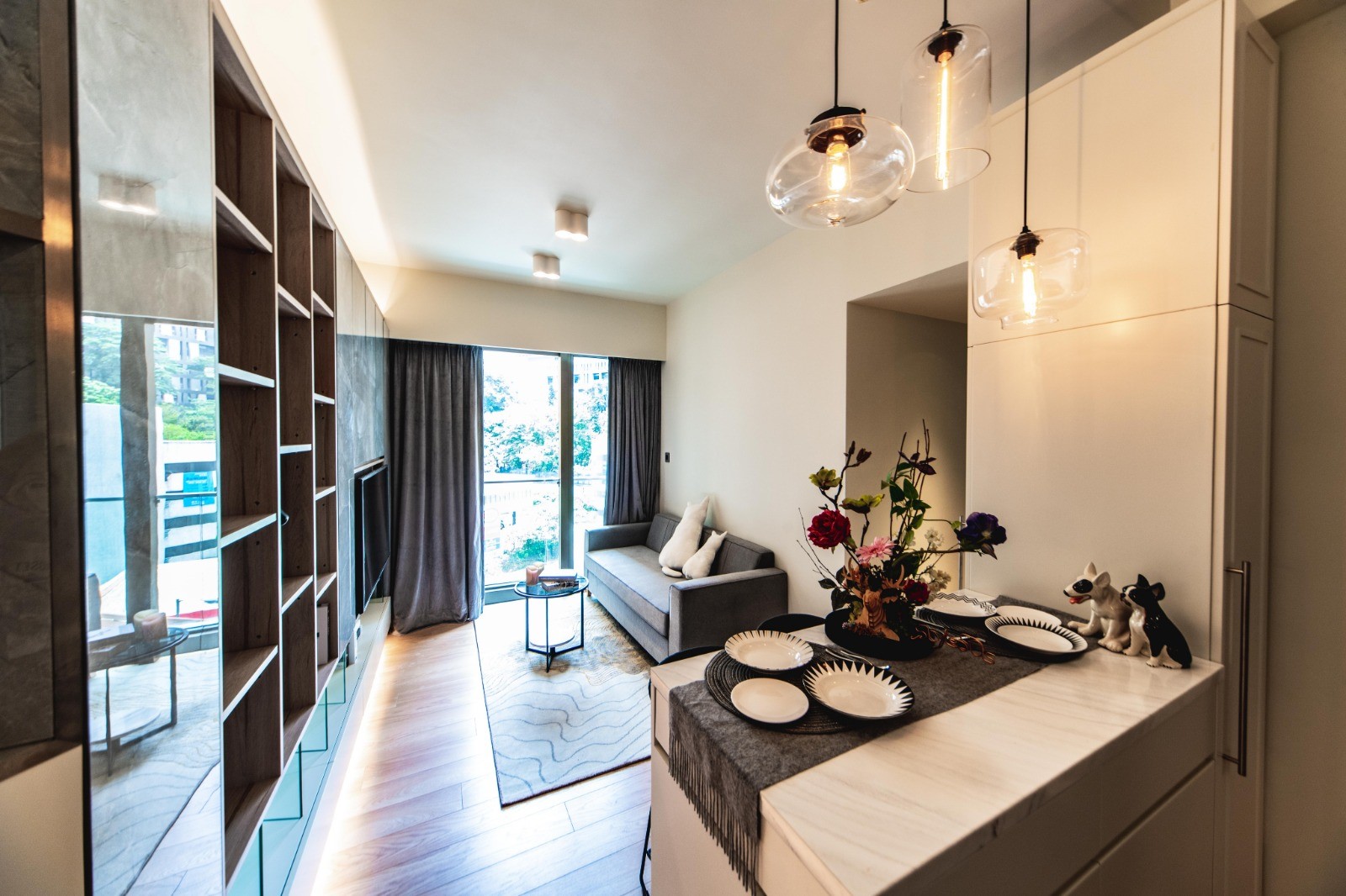 客飯廳再配合不同質感的建材,例如灰色雲石、淺色木材等,為單位營造層次感,同時亦以線條利落的燈具,突顯屋內空間感。