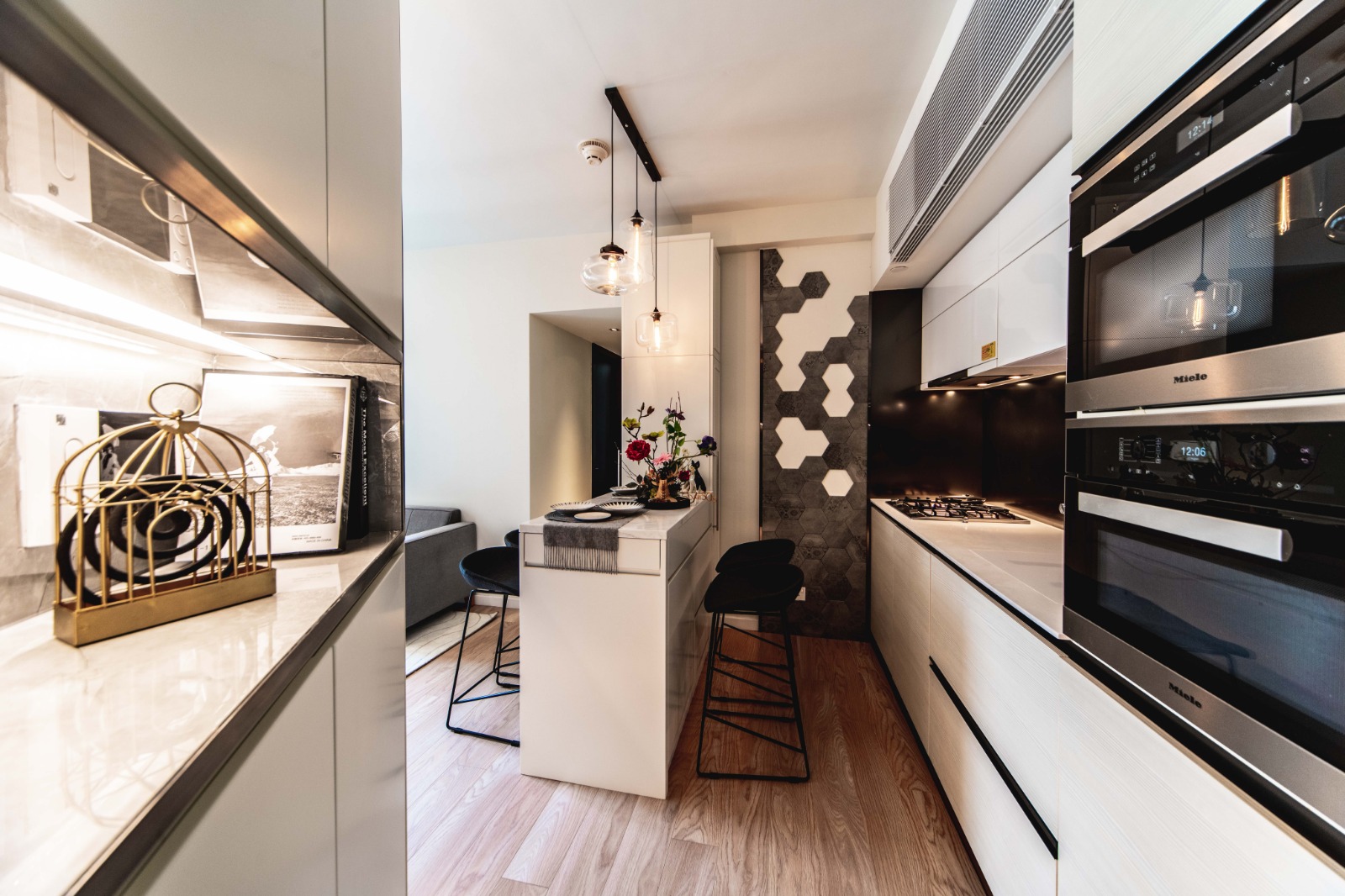 廚房同樣配合灰色雲石、淺色木材、相同色系的爐具。